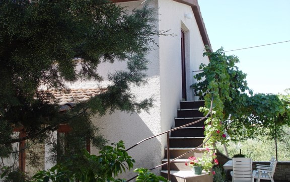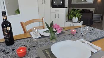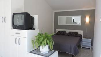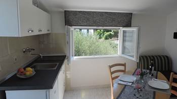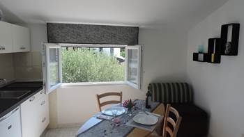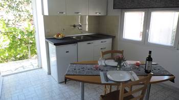 Studio-Wohnung in Krnica besteht aus einem liebevoll eingerichteten Schlafzimmer mit Doppelbett, voll ausgestattete Küche und eine möblierte Terrasse mit einem Kamin aus Stein.