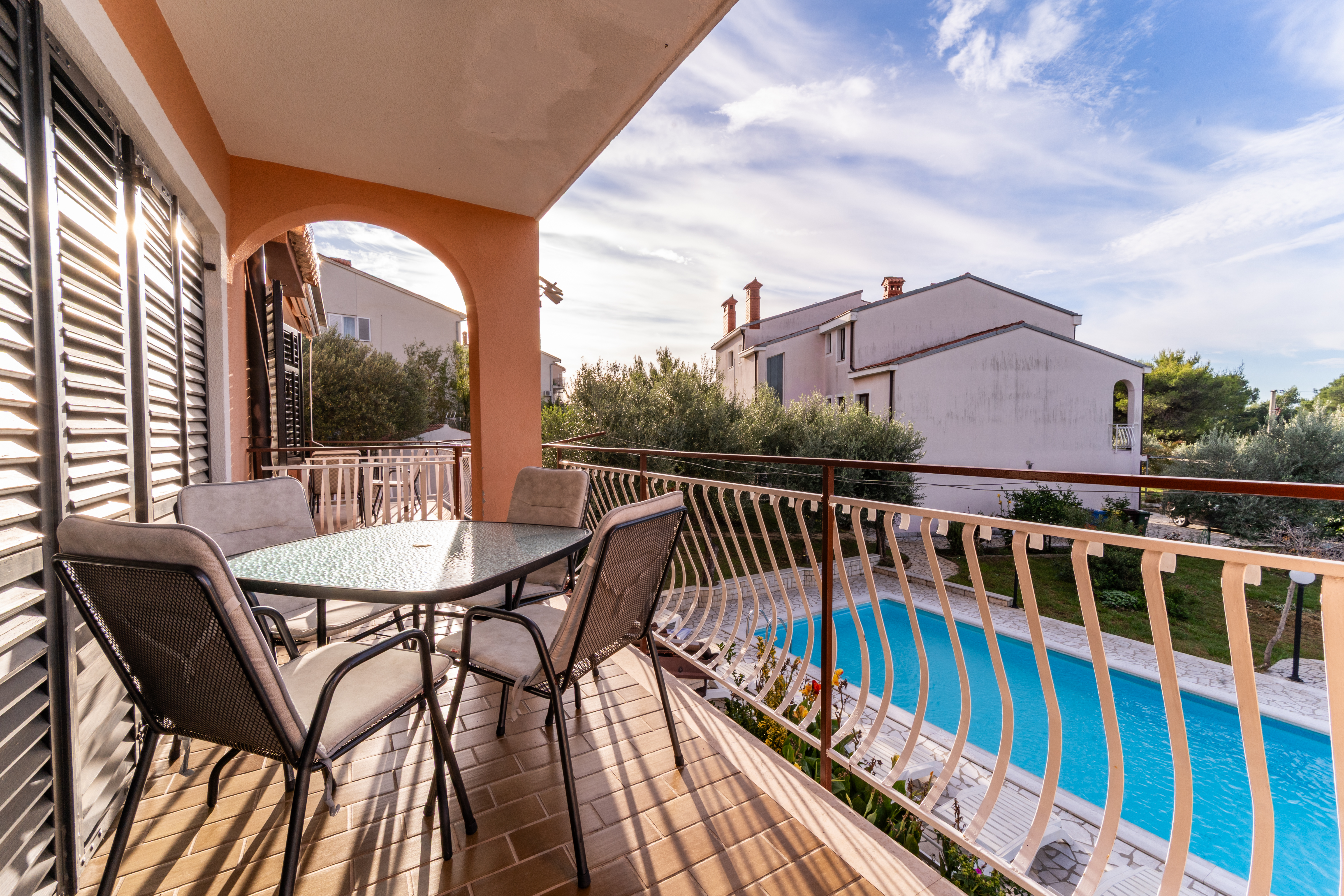- Tisch und Stühle auf dem Balkon