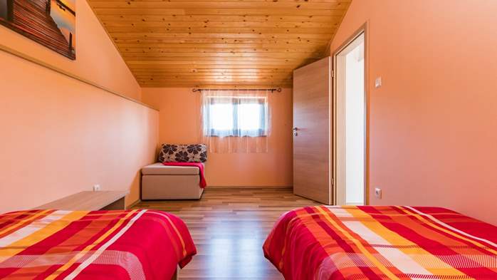 Provedite nezaboravno ljeto u komfornom apartmanu za 5 osoba u Baratu. Vanjski bazen, igralište za djecu, zatvorena terasa, dvije spavaće sobe, aparat za kavu, 1 dodatni ležaj na kauču, parking, vrt