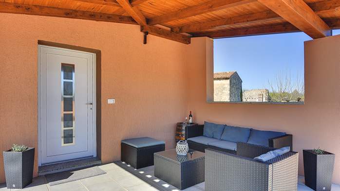 Prenotatevi un comodo appartamento a Krnica per 4 persone, dettagli in pietra, macchina per caffè, piscina comune e bellissimo giardino, WiFi, bagno con doccia, barbecue, terrazza